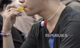 Massa yang tergabung dalam Forum Masyarakat Sipil Jawa Barat melakukan aksi Meniup Peluit Bagi Indonesia di Cikapundung River Spot, Kota Bandung, Jawa Barat, Selasa (7/11/2023). Aksi tersebut merupakan bentuk kritik dan protes terhadap Putusan MK Nomor 90/PUU-XXI/2023 terkait syarat minimum usia calon presiden dan calon wakil presiden. Selain itu, aksi tersebut bertujuan untuk memberi tanda melewati batas atau offside demi kembalinya kehormatan berbangsa dan bernegara. (FOTO : REPUBLIKA/ABDAN SYAKURA)
