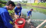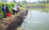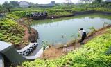 Petugas Dinas Sumber Daya Air dan Bina Marga (DSDABM) melepas ikan di kolam retensi Rancasari saat persemian di Jalan Inten Raya, Kecamatan Rancasari, Kota Bandung, Rabu (8/11/2023). Dengan adanya kolam retensi tersebut diharapkan dapat mengurangi dampak banjir di musim hujan, khususnya di Kecamatan Rancasari dan sekitarnya. (FOTO : Edi Yusuf/Republika)