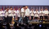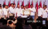 Bakal calon presiden dari Koalisi Indonesia Maju (KIM) Prabowo Subianto (tengah) menerima piagam deklarasi dari Ketua Umum relawan Barisan Pengusaha Pejuang Bobby Nasution saat acara deklarasi dukungan Pilpres 2024 di Jakarta, Rabu (8/11/2023). Relawan Barisan Pengusaha Pejuang mendeklarasikan dukungannya untuk bakal calon presiden dan wakil presiden dari Koalisi Indonesia Maju (KIM) Prabowo Subianto-Gibran Rakabuming Raka pada Pilpres 2024. (FOTO : Republika/Putra M. Akbar)