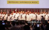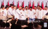 Bakal calon presiden dari Koalisi Indonesia Maju (KIM) Prabowo Subianto (kelima kanan), Ketua Umum relawan Barisan Pengusaha Pejuang Bobby Nasution (keempat kanan) dan Ketua Dewan Pembina Relawan Barisan Pegusaha Pejuang Akbar Himawan Buchari (keenam kanan) berfoto bersama saat acara deklarasi dukungan Pilpres 2024 di Jakarta, Rabu (8/11/2023). Relawan Barisan Pengusaha Pejuang mendeklarasikan dukungannya untuk bakal calon presiden dan wakil presiden dari Koalisi Indonesia Maju (KIM) Prabowo Subianto-Gibran Rakabuming Raka pada Pilpres 2024. (FOTO : Republika/Putra M. Akbar)