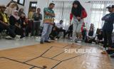 Peserta mengikuti permainan engklek dalam perlombaan permainan tradisional di Museum Rumoh Aceh, Banda Aceh, Aceh, Rabu (8/11/2023). Lomba permainan tradisional pada Pekan Kebudayaan Aceh (PKA) ke-8 itu diikuti peserta dari seluruh kabupaten/kota di Aceh, seperti permainan dayung perahu, enggrang, layang-layang, catur harimau, engklek dan gasing, sebagai upaya merawat dan menjaga kelestarian permainan tradisional. (FOTO : Antara/Khalis Surry)