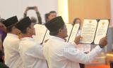 Narapidana Teroris (Napiter) membaca teks Pancasila usai membacakan ikrar setia kepada NKRI di Lapas Kelas IIA Wirogunan, Yogyakarta, Kamis (9/11/2023). Dalam ikrarnya ketiganya mengakui Pancasila dan UUD 1945 tidak bertentangan dengan pemahaman agama yang mereka yakini serta keluar dari baiat aliran yang terdahulu. Selanjutnya, mereka akan bergabung dengan aliansi teroris manapun serta akan mengikuti program pembinaan dan deradikalisasi oleh Lembaga Pemasyarakatan atau instansi lain. (FOTO : Republika/Wihdan Hidayat)