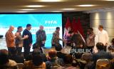 Presiden FIFA Gianni Infantino bersama Ketua PSSI Erick Thohir dan Menteri Keuangan Sri Mulyani saat meresmikan kantor FIFA Jakarta, Jumat (10/11/2023). Kantor FIFA Jakarta berlokasi di Menara Mandiri II, Jalan Jenderal Sudirman, Jakarta. Kantor FIFA Jakarta berstatus sebagai FIFA Permanent Office South Asian Hub atau kantor penghubung permanen FIFA untuk Asia Tenggara. (FOTO : Dok Republika)