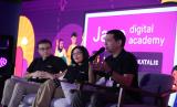 Direktur Utama Bank Jago Arief Harris Tandjung, Head of Communication, Culture and Sustainability Bank Jago Maya Kartika, dan CEO Dkatalis Kharim Siregar saat konferensi pers peluncurkan Jago Digital Academy di Jakarta, Kamis (8/11/2023). (FOTO : Republika/ Retno Wulandhari)
