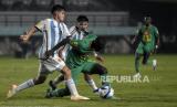 Bek Timnas Argentina Dylan Gorosito (kiri) berebut bola dengan pemain Timnas Senegal pada pertandingan babak penyisihan Grup D Piala Dunia U17 2023 di Stadion Si Jalak Harupat, Kabupaten Bandung, Jawa Barat, Sabtu (11/11/2023). Dalam pertandingan tersebut Timnas Senegal berhasil mengalahkan Timnas Argentina dengan skor akhir 2-1. (FOTO : REPUBLIKA/ABDAN SYAKURA)