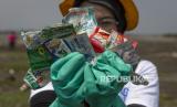 Aktivis lingkungan Greenpeace Indonesia menunjukkan sejumlah sampah rumah tangga saat kegiatan bersih sampah dan audit merek (brand audit) di Pantai Tirang, Semarang, Jawa Tengah, Ahad (12/11/2023). Dalam aksi tersebut Greenpeace Indonesia melalui kampanye Break Free From Plastic ingin menekankan tanggung jawab produsen yang diperluas (Extended Producer Responsibility) atas pengolahan atau pembuangan produk pasca-konsumen serta mendorong produsen untuk berkomitmen mengurangi penggunaan plastik sekali pakai dan bungkusan sesuai dengan mandat peraturan Kementerian Lingkungan Hidup dan Kehutanan untuk peta jalan pengurangan sampah oleh produsen pada tahun 2030. (FOTO : ANTARA FOTO/Aji Styawan)