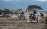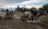 REPUBLIKA.CO.ID, SIGI -- Peserta memacu sapinya pada lomba karapan sapi di Desa Tinggede, Sigi, Sulawesi Tengah, Ahad (12/11/2023). Selain menjadi bentuk ungkapan syukur atas usainya panen, acara tersebut juga menjadi wahana merekatkan silaturahmi antarkelompok masyarakat dari desa-desa sekitarnya.