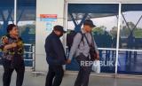 REPUBLIKA.CO.ID, SORONG -- Penjabat Bupati Sorong Yan Piet Mosso (tengah) didampingi istri (kiri) memasuki ruang keberangkatan Bandara DEO Kota Sorong, Papua Barat Daya, Senin (13/11/2023).