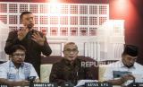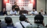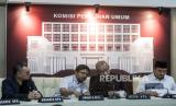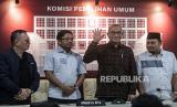 REPUBLIKA.CO.ID, JAKARTA. -- Ketua KPU Hasyim Asyari (kedua kanan) bersama Komisioner KPU Mochammad Afifuddin (kanan), Idham Holik (kedua kiri) dan Parsadaan Harahap bersiap menyampaikan konferensi pers di Jakarta, Senin (13/11/2023).
