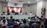 Ketua KPU Hasyim Asyari bersama Komisioner KPU Mochammad Afifuddin, Idham Holik, Parsadaan Harahap, Betty Epsilon Idroos dan August Mellaz menyampaikan konferensi pers di Jakarta, Senin (13/11/2023). KPU resmi menetapkan tiga pasangan capres dan cawapres yaitu Anies Baswedan-Muhaimin Iskandar, Ganjar Pranowo-Mahfud MD dan Prabowo Subianto-Gibran Rakabuming Raka telah memenuhi syarat untuk mengikuti Pemilu 2024. (FOTO : Republika/Putra M. Akbar)