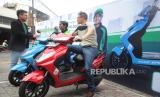 CEO PT. Green City Traffic William Teng (kanan), Sales Manager ECGO Rizky Maarif (kiri) berbincang dengan pengemudi ojek online saat penyerahan unit motor listrik ECGO 3di Jakarta, Senin (13/11/2023). Motor listrik ini telah memperoleh sertifikasi Tingkat Komponen Dalam Negeri (TKDN) sebesar 57,89% dari Kementerian Perindustrian dalam memenuhi standar industri nasional. Untuk meningkatkan akses terhadap transportasi yang ramah lingkungan di Indonesia, ECGO bekerja sama dengan distributor resminya EVMOTO, telah meluncurkan motor listrik ECGO 3 A/T dengan harga terjangkau sebesar 7,9 juta Rupiah. (FOTO : Republika/Tahta Aidilla)