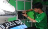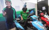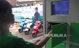 Pengemudi Ojek online sedang menganti baterai motor listrik ECGO 3 di Jakarta, Senin (13/11/2023). Motor listrik ini telah memperoleh sertifikasi Tingkat Komponen Dalam Negeri (TKDN) sebesar 57,89% dari Kementerian Perindustrian dalam memenuhi standar industri nasional. (FOTO : Republika/Tahta Aidilla)