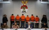 Pj Bupati Sorong Yan Piet Mosso memakai rompi tahanan saat dihadirkan pada konferensi pers di Gedung Merah Putih KPK, Jakarta, Selasa (14/11/2023). KPK menetapkan Pj Bupati Sorong Yan Piet Mosso beserta lima orang lainnya yang terjaring OTT menjadi tersangka kasus dugaan suap terkait pengondisian temuan laporan Badan Pemeriksaan Keuangan (BPK) untuk wilayah Provinsi Papua Barat Daya Tahun Anggaran 2023. Pada OTT tersebut KPK mengamankan uang sekitar Rp 940 juta dan satu jam tangan merek Rolex. (FOTO : Republika/Putra M. Akbar)