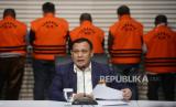 Ketua KPK Firli Bahuri (kedua kanan) menyampaikan konferensi pers di Gedung Merah Putih KPK, Jakarta, Selasa (14/11/2023). KPK menetapkan Pj Bupati Sorong Yan Piet Mosso beserta lima orang lainnya yang terjaring OTT menjadi tersangka kasus dugaan suap terkait pengondisian temuan laporan Badan Pemeriksaan Keuangan (BPK) untuk wilayah Provinsi Papua Barat Daya Tahun Anggaran 2023. Pada OTT tersebut KPK mengamankan uang sekitar Rp 940 juta dan satu jam tangan merek Rolex. (FOTO : Republika/Putra M. Akbar)
