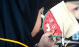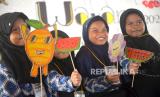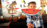 Siswa sekolah dasar menunjukkan wayang kontemporer berbentuk semangka di pendopo Akademik Komunitas Negeri (AKN) Seni Budaya Yogyakarta, Selasa (14/11/2023). Sebanyak 50an siswa sekolah dasar mengikuti pelatihan membuat wayang kontemporer menggunakan kardus bekas. Acara ini diadakan dalam rangka Hari Wayang Nasional dan Dunia dengan tujuan untuk mengajak anak-anak mencintai wayang dan mempercepat regenerasi pembuat wayang. Berbagai karakter wayang dibuat oleh anak-anak dan dibantu oleh pemandu dalam pembuatannya. (FOTO : Republika/Wihdan Hidayat)