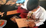 Siswa sekolah dasar menggambar wayang kontemporer di pendopo Akademik Komunitas Negeri (AKN) Seni Budaya Yogyakarta, Selasa (14/11/2023). Sebanyak 50an siswa sekolah dasar mengikuti pelatihan membuat wayang kontemporer menggunakan kardus bekas. Acara ini diadakan dalam rangka Hari Wayang Nasional dan Dunia dengan tujuan untuk mengajak anak-anak mencintai wayang dan mempercepat regenerasi pembuat wayang. Berbagai karakter wayang dibuat oleh anak-anak dan dibantu oleh pemandu dalam pembuatannya. (FOTO : Republika/Wihdan Hidayat)