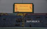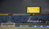 Layar menampilkan pemberitahuan pertandingan ditangguhkan akibat cuaca saat pertandingan babak penyisihan Grup D Piala Dunia U17 2023 antara Timnas Polandia melawan Timnas Senegal di Stadion Si Jalak Harupat, Kabupaten Bandung, Jawa Barat, Selasa (14/11/2023). (FOTO : REPUBLIKA/ABDAN SYAKURA)