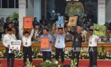 Tiga pasangan Capres dan Cawapres memegang plakat nomer urut usai pengundian di KPU, Jakarta, Selasa (14/11/2023)malam. (FOTO : Republika/Prayogi)