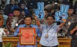 Pasangan Capres Prabowo Subianto (kiri) dan Cawapres Gibran Rakabuming Raka memegang plakat nomer urut 2 usai pengundian di KPU, Jakarta, Selasa (14/11/2023). (FOTO : Republika/Prayogi)