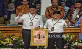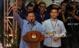 Pasangan Calon Presiden dan Wakil Presiden No Urut 2 Prabowo Subianto dan Gibran Rakabuming Raka memberikan sambutan dalam acara pengundian dan penetapan nomor urut pasangan calon presiden dan wakil presiden dalam pemilihan umum tahun 2024 di Gedung KPU, Jakarta, Selasa (14/11/2023). Pasangan Anies Baswedan dan Muhaimin Iskandar mendapatkan nomor urut 1, Pasangan Prabowo Subianto dan Gibran Rakabuming Raka mendapatkan nomor urut 2 dan Pasangan Ganjar Pranowo dan Mahfud MD mendapatkan nomor urut 3. (FOTO : Republika/Prayogi)
