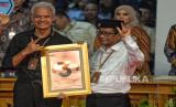 Pasangan Capres Ganjar Pranowo (kiri) dan Cawapres Mahfud MD memegang plakat nomer urut 3 usai pengundian di KPU, Jakarta, Selasa (14/11/2023)malam. (FOTO : Republika/Prayogi)