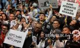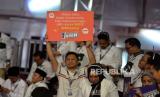 Pendukung Pasangan Calon Presiden dan Wakil Presiden No Urut 3 Ganjar Pranowo dan Mahfud MD turut memerihakan acara pengundian dan penetapan nomor urut pasangan calon presiden dan wakil presiden dalam pemilihan umum tahun 2024 di Gedung KPU, Jakarta, Selasa (14/11/2023). Para pendukung masing-masing pasangan meyambut gembira hasil pengundian nomor urut tersebut. (FOTO : Republika/Prayogi)