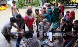 Sejumlah petugas kesehatan dari Direktorat Samapta Polda Sumatera Utara memeriksa kesehatan warga yang terdampak banjir di Desa Tanjung Sari, Kabupaten Deli Serdang, Sumatera Utara, Selasa (14/11/2023). Sebanyak 50 personel dari Polda Sumut membantu memberikan layanan kesehatan bagi 23.472 warga yang terdampak banjir di daerah tersebut.  (FOTO : ANTARA FOTO/Yudi)