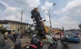 REPUBLIKA.CO.ID,BOGOR -- Sejumlah pengendara melintas di samping alat berat (crane) yang roboh di Jalan Raya Mayor Oking, Cibinong, Kabupaten Bogor, Jawa Barat, Rabu (15/11/2023).