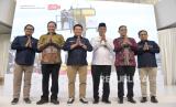Direktur Operasi Bidang Gedung PT PP (Persero) Tbk Yuyus Juarsa, Ketua Diaspora Global Aceh Mustafa Abubakar, Direktur Utama BSI Hery Gunardi, Asisten 3 Provinsi Aceh Iskandar, Kepala OJK Aceh Yusri, dan Komisaris Utama BSI Muliaman D Hadad (dari kiri) berfoto bersama seusai topping off Green Building BSI Aceh, Banda Aceh (15/11/2023). PT Bank Syariah Indonesia Tbk. (BSI) menargetkan gedung landmark Perseroan di Aceh senilai Rp325 miliar dapat diresmikan pada Maret 2024, menyusul rampungnya konstruksi yang ditandai topping off. Gedung berkonsep green building ini menekankan komitmen BSI memajukan perekonomian di Serambi Mekah. (FOTO : Dok Republika)