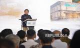 Direktur Utama BSI Hery Gunardi memberikan sambutan saat topping off Green Building BSI Aceh, Banda Aceh (15/11/2023). PT Bank Syariah Indonesia Tbk. (BSI) menargetkan gedung landmark Perseroan di Aceh senilai Rp325 miliar dapat diresmikan pada Maret 2024, menyusul rampungnya konstruksi yang ditandai topping off. Gedung berkonsep green building ini menekankan komitmen BSI memajukan perekonomian di Serambi Mekah. (FOTO : Dok Republika)