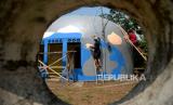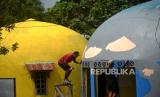 Seniman menggambar mural di Desa Wisata Rumah Domes, Prambanan, Sleman , Yogyakarta, Rabu (15/11/2023). Kegiatan menggambar rumah domes ini dalam rangka Pekan Budaya Difabel (PBD) 2023 dengan tema Obah Mamah Mingset Greget. Berbagai macam tema mural akan digarap oleh seniman yang lolos kurasi. Waktu menggambar rumah berbentuk bulat peninggalan gempa 2006 ini dilakukan hingga Ahad (19/11/2023) mendatang. Lebih dari 10 rumah domes yang nanti akan di mural oleh seniman yang berbeda. (FOTO : Republika/Wihdan Hidayat)
