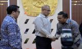 Ketua KPU Hasyim Asyari (tengah) bejabat tangan dengan Head of Public Policy and Government Relation Tiktok Indonesia Firry Wahid (kanan) usai menandatangani nota kesepahaman di Gedung KPU, Jakarta, Rabu (15/11/2023). KPU bersama Tiktok memperkuat komitmen bersama dalam mendorong integritas Pemilu 2024 melalui berbagai upaya proaktif bersama para pemangku kepentingan terkait. Selain itu TikTok bersama KPU juga akan fokus memberikan informasi resmi terkait tata cara pemilu kepada pengguna serta program edukasi publik lainnya. (FOTO : Republika/Prayogi)