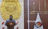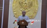 Ketua KPU Hasyim Asyari memberikan sambutan usai menandatangani nota kesepahaman di Gedung KPU, Jakarta, Rabu (15/11/2023). KPU bersama Tiktok memperkuat komitmen bersama dalam mendorong integritas Pemilu 2024 melalui berbagai upaya proaktif bersama para pemangku kepentingan terkait. Selain itu TikTok bersama KPU juga akan fokus memberikan informasi resmi terkait tata cara pemilu kepada pengguna serta program edukasi publik lainnya. (FOTO : Republika/Prayogi)