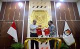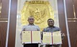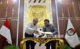 Ketua KPU Hasyim Asyari (kiri) bersama Head of Public Policy and Government Relation Tiktok Indonesia Firry Wahid (kanan) menandatangani nota kesepahaman di Gedung KPU, Jakarta, Rabu (15/11/2023). KPU bersama Tiktok memperkuat komitmen bersama dalam mendorong integritas Pemilu 2024 melalui berbagai upaya proaktif bersama para pemangku kepentingan terkait. Selain itu TikTok bersama KPU juga akan fokus memberikan informasi resmi terkait tata cara pemilu kepada pengguna serta program edukasi publik lainnya. (FOTO : Republika/Prayogi)