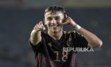 Gelandang Timnas Jerman Bilal Yalcinkaya melakukan selebrasi usai mencetak gol ke gawang Selandia Baru pada pertandingan babak penyisihan Grup F Piala Dunia U17 2023 di Stadion Si Jalak Harupat, Kabupaten Bandung, Jawa Barat, Rabu (15/11/2023). Dalam pertandingan tersebut Timnas Jerman berhasil mengalahkan Timnas Selandia Baru dengan skor akhir 3-1. (FOTO : REPUBLIKA/ABDAN SYAKURA)