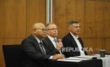 Presiden Wartsila Energi Anders Lindberg (tengah) bersama Wakil Presiden Timur Tengah & Asia, Wartsila Energy Frederic Carron (kanan), dan Direktur Energy Business New Build Wartsila Energy Febron Siregar berbicara kepada media dalam pameran Enlit Asia di ICE BSD City, Serpong, Tangsel , Rabu (15/11/2023). (FOTO : Republika/Tahta Aidilla)