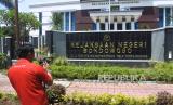 REPUBLIKA.CO.ID,BONDOWOSO -- Seorang jurnalis mengambil gambar papan nama Kejaksaan Negeri Bondowoso, Jawa Timur, Kamis (16/11/2023).