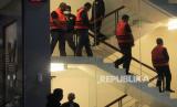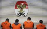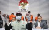 Sejumlah tersangka kasus dugaan tindak pidana korupsi berupa pemberian hadiah atau janji dalam rangka pengurusan perkara di Kejaksaan Negeri Bondowoso memakai rompi tahanan usai menjalani pemeriksaan pasca OTT di Gedung Merah Putih KPK, Jakarta, Kamis (16/11/2023). Dari OTT tersebut KPK menahan Kajari Bondowoso Puji Triasmoro dan Kasi Pidsus Kejari Bondowoso Alexander Silaen beserta dua orang pihak swasta terkait dugaan tindak pidana korupsi berupa pemberian hadiah atau janji dalam rangka pengurusan perkara di Kejaksaan Negeri Bondowoso, dengan barang bukti berupa uang senilai Rp 450 juta. (FOTO : Republika/Putra M. Akbar)