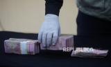 Petugas memperlihatkan barang bukti kasus dugaan tindak pidana korupsi berupa pemberian hadiah atau janji dalam rangka pengurusan perkara di Kejaksaan Negeri Bondowoso di Gedung Merah Putih KPK, Jakarta, Kamis (16/11/2023). Dari OTT tersebut KPK menahan Kajari Bondowoso Puji Triasmoro dan Kasi Pidsus Kejari Bondowoso Alexander Silaen beserta dua orang pihak swasta terkait dugaan tindak pidana korupsi berupa pemberian hadiah atau janji dalam rangka pengurusan perkara di Kejaksaan Negeri Bondowoso, dengan barang bukti berupa uang senilai Rp 450 juta. (FOTO : Republika/Putra M. Akbar)