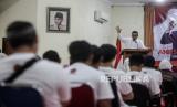 Pendukung meneriakan yel-yel saat acara deklarasi Garda Matahari di Gedoeng Joeang 45, Menteng, Jakarta, Jumat (17/11/2023). Garda Matahari mendeklarasikan dukungan pada Pilpres 2024 untuk pasangan Capres Anies Baswedan dan Cawapres Muhaimin Iskandar sebagai sebuah ikhtiar politik dalam menegakan keadilan dan demokrasi. (FOTO : Republika/Putra M. Akbar)