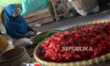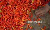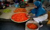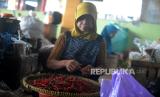 Pedang memilah cabai merah besar di Pasar Beringharjo, Yogyakarta, Jumat (17/11/2023). Harga cabai di Pasar Beringharjo belum juga turun sejak awal bulan ini. Harga yang paling tinggi yakni Cabai Rawit masih berada di Rp 80 ribu per kilogram dan Cabai Merah Besar per kilogramnya seharga Rp 60 ribu. Menurut pedagang, banyaknya gagal panen di tingkat petani yang menyebabkan naiknya harga cabai di pasar. (FOTO : Republika/Wihdan Hidayat)