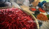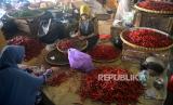 Pedagang memilah cabai merah besar di Pasar Beringharjo, Yogyakarta, Jumat (17/11/2023). Harga cabai di Pasar Beringharjo belum juga turun sejak awal bulan ini. Harga yang paling tinggi yakni Cabai Rawit masih berada di Rp 80 ribu per kilogram dan Cabai Merah Besar per kilogramnya seharga Rp 60 ribu. Menurut pedagang, banyaknya gagal panen di tingkat petani yang menyebabkan naiknya harga cabai di pasar. (FOTO : Republika/Wihdan Hidayat)