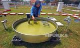 Petugas Badan Meteorologi Klimatologi dan Geofisika (BMKG) Banten memeriksa volume air pada panci penguapan (Open Pan Evaporimeter) di laboratorium terbuka BMKG Banten di Serang, Jumat (17/11/2023). Kepala BMKG Wilayah II Jakarta Hartanto menyatakan, puncak musim hujan diprediksi akan terjadi pada bulan Januari hingga Februari 2024 dan mengimbau semua pihak terkait untuk melakukan langkah antisipasi menghadapi potensi bencana hidrometeorologi. (FOTO : Antara/Asep Fathulrahman)
