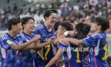 Sejumlah pemain Timnas Jepang melakukan selebrasi pada pertandingan babak penyisihan Grup D Piala Dunia U17 2023 di Stadion Si Jalak Harupat, Kabupaten Bandung, Jawa Barat, Jumat (17/11/2023). Dalam pertandingan tersebut Timnas Jepang berhasil mengalahkan Timnas Senegal dengan skor akhir 2-0. (FOTO : REPUBLIKA/ABDAN SYAKURA)