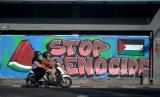 Mural dukungan untuk Palestina bergambar Stop Genocide di kawasan Gondomanan, Yogyakarta, Jumat (17/11/2023). Beberapa mural dukungan untuk kemerdekaan Palestina dan mengecam Israel terpampang di beberapa sudut Kota Yogyakarta. Warga menggambar mural dukungan untuk kebebasan Palestina dan juga bentuk keprihatinan atas genosida warga Gaza oleh Israel. (FOTO : Republika/Wihdan Hidayat)