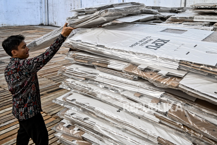 REPUBLIKA.CO.ID, TANGERANG -- Petugas menata kotak suara di gudang Logistik Pemilu Kota Tangerang, Banten, Jumat (17/11/2023).