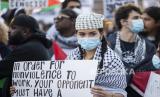 Mereka mengenakan atribut kafiyeh khas palestina, bendera palestina dan poster berisikan seruan gencatan senjata. (FOTO : EPA-EFE/JIM LO SCALZO)