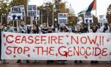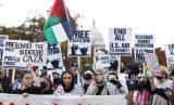 Ratusan pengunjukrasa berdemo di Stasiun Union, Washington DC, Amerika Serikat, Jumat (17/11/2023) petang. (FOTO : EPA-EFE/JIM LO SCALZO)