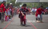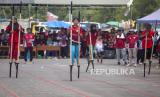REPUBLIKA.CO.ID, INDRAMAYU -- Sejumlah pelajar beradu cepat saat mengikuti olahraga tradisional balap Egrang di Sport Center Indramayu, Jawa Barat, Sabtu(18/11/2023).