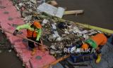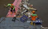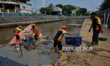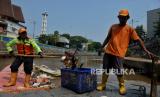 Petugas UPK Badan Air Dinas Lingkungan Hidup DKI Jakarta mengangkut sampah di aliran Kali Ciliwung, Jakarta, Ahad (19/11/2023). Pemprov DKI Jakarta mengajak kepada seluruh elemen masyarakat dan dinas terkait untuk melakukan pembersihan saluran air mulai dari selokan hingga kanal atau sungai, sebagai upaya antisipasi potensi banjir akibat timbunan sampah dan endapan lumpur saat curah hujan tinggi. (FOTO : Republika/Thoudy Badai)